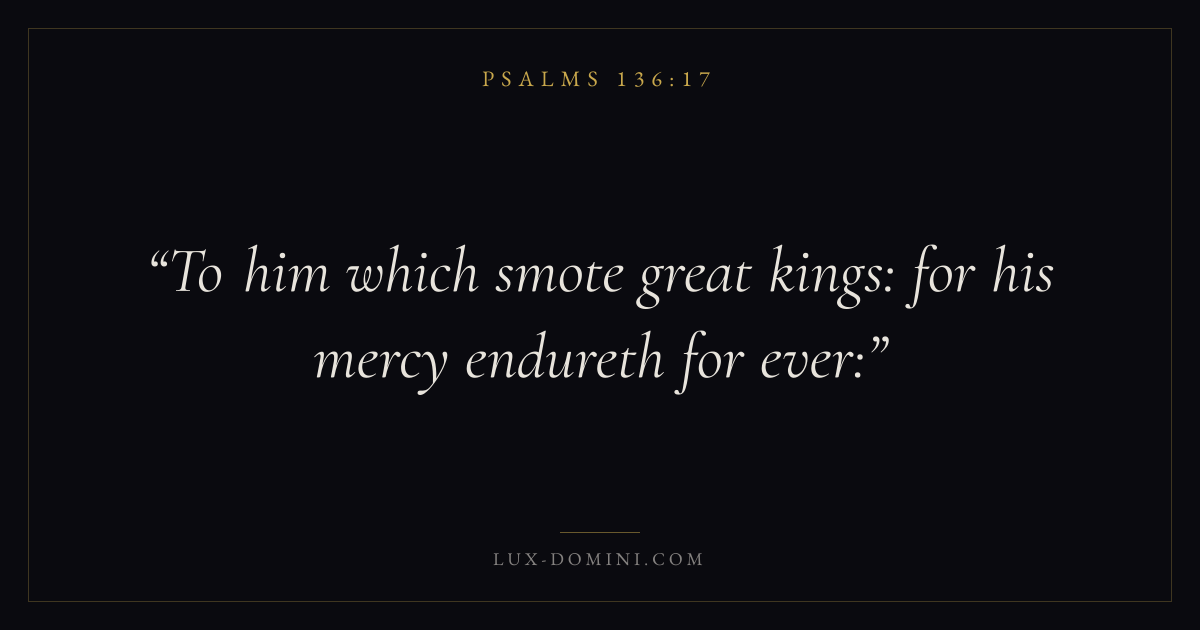 Books / Psalms / Chapter 136 / Verse 17 ← Psalms 136:16 Psalms 136:17 Psalms 136:18 → To him which smote great kings: for his mercy endureth for ever: Download verse card Share on Twitter Share on Facebook Pin it ✦ Key themes FaithPrayerJustice and mercyPraise Read with Hebrews 11:1Romans 10:17Matthew 6:9Luke 18:1 Related topics Bible verses about faithBible verses about prayerBible verses about justice and mercyBible verses about thankfulness and gratitude ✦ Psalms Chapter 136 verses V. 1 V. 2 V. 3 V. 4 V. 5 V. 6 V. 7 V. 8 V. 9 V. 10 V. 11 V. 12 V. 13 V. 14 V. 15 V. 16 V. 17 V. 18 V. 19 V. 20 V. 21 V. 22 V. 23 V. 24 V. 25 V. 26