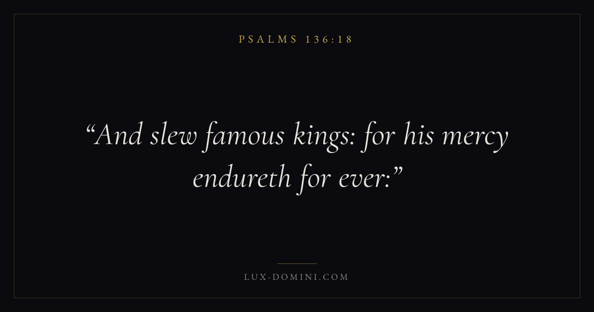 Books / Psalms / Chapter 136 / Verse 18 ← Psalms 136:17 Psalms 136:18 Psalms 136:19 → And slew famous kings: for his mercy endureth for ever: Download verse card Share on Twitter Share on Facebook Pin it ✦ Key themes FaithPrayerJustice and mercyPraise Read with Hebrews 11:1Romans 10:17Matthew 6:9Luke 18:1 Related topics Bible verses about faithBible verses about prayerBible verses about justice and mercyBible verses about thankfulness and gratitude ✦ Psalms Chapter 136 verses V. 1 V. 2 V. 3 V. 4 V. 5 V. 6 V. 7 V. 8 V. 9 V. 10 V. 11 V. 12 V. 13 V. 14 V. 15 V. 16 V. 17 V. 18 V. 19 V. 20 V. 21 V. 22 V. 23 V. 24 V. 25 V. 26