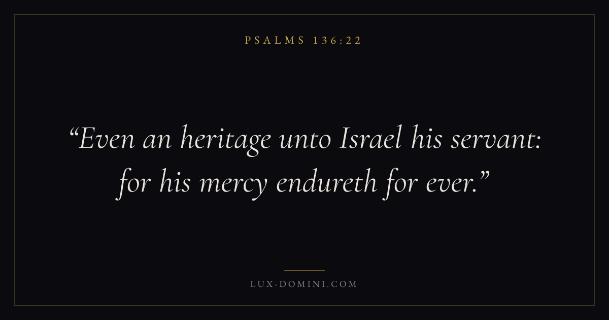 Books / Psalms / Chapter 136 / Verse 22 ← Psalms 136:21 Psalms 136:22 Psalms 136:23 → Even an heritage unto Israel his servant: for his mercy endureth for ever. Download verse card Share on Twitter Share on Facebook Pin it ✦ Key themes FaithPrayerJustice and mercyPraise Read with Hebrews 11:1Romans 10:17Matthew 6:9Luke 18:1 Related topics Bible verses about faithBible verses about prayerBible verses about justice and mercyBible verses about thankfulness and gratitude ✦ Psalms Chapter 136 verses V. 1 V. 2 V. 3 V. 4 V. 5 V. 6 V. 7 V. 8 V. 9 V. 10 V. 11 V. 12 V. 13 V. 14 V. 15 V. 16 V. 17 V. 18 V. 19 V. 20 V. 21 V. 22 V. 23 V. 24 V. 25 V. 26