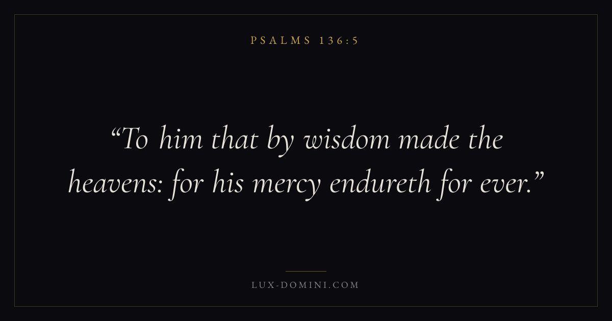 Books / Psalms / Chapter 136 / Verse 5 ← Psalms 136:4 Psalms 136:5 Psalms 136:6 → To him that by wisdom made the heavens: for his mercy endureth for ever. Download verse card Share on Twitter Share on Facebook Pin it ✦ Key themes FaithPrayerWisdomJustice and mercyPraise Read with Hebrews 11:1Romans 10:17Matthew 6:9Luke 18:1 Related topics Bible verses about faithBible verses about prayerBible verses about wisdomBible verses about justice and mercyBible verses about thankfulness and gratitude ✦ Psalms Chapter 136 verses V. 1 V. 2 V. 3 V. 4 V. 5 V. 6 V. 7 V. 8 V. 9 V. 10 V. 11 V. 12 V. 13 V. 14 V. 15 V. 16 V. 17 V. 18 V. 19 V. 20 V. 21 V. 22 V. 23 V. 24 V. 25 V. 26
