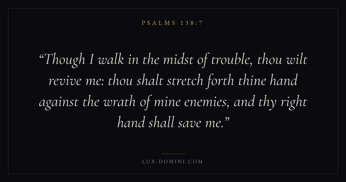 Though I walk in the midst of trouble, thou wilt revive me: thou shalt stretch forth thine hand against the wrath of mine enemies, and thy right hand shall save me.