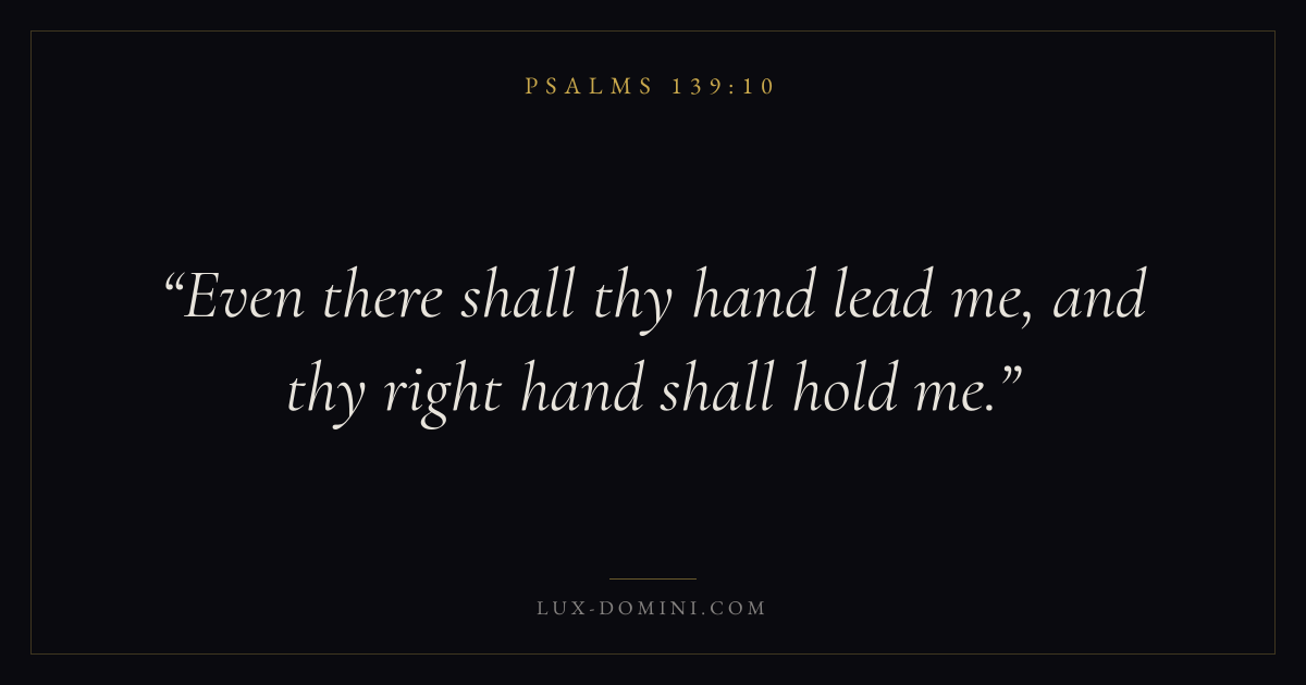 Books / Psalms / Chapter 139 / Verse 10 ← Psalms 139:9 Psalms 139:10 Psalms 139:11 → Even there shall thy hand lead me, and thy right hand shall hold me. Download verse card Share on Twitter Share on Facebook Pin it ✦ Key themes FaithPrayerPraiseLament Read with Hebrews 11:1Romans 10:17Matthew 6:9Luke 18:1 Related topics Bible verses about faithBible verses about prayerBible verses about thankfulness and gratitudeBible verses about grief and loss ✦ Psalms Chapter 139 verses V. 1 V. 2 V. 3 V. 4 V. 5 V. 6 V. 7 V. 8 V. 9 V. 10 V. 11 V. 12 V. 13 V. 14 V. 15 V. 16 V. 17 V. 18 V. 19 V. 20 V. 21 V. 22 V. 23 V. 24
