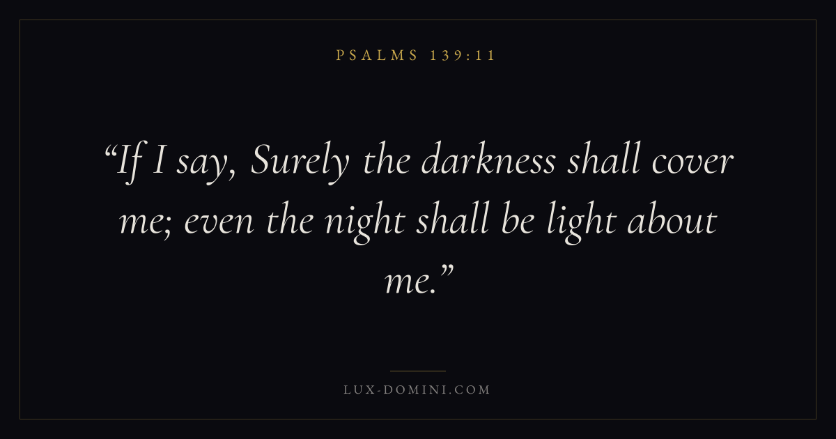 Books / Psalms / Chapter 139 / Verse 11 ← Psalms 139:10 Psalms 139:11 Psalms 139:12 → If I say, Surely the darkness shall cover me; even the night shall be light about me. Download verse card Share on Twitter Share on Facebook Pin it ✦ Key themes FaithPrayerPraiseLament Read with Hebrews 11:1Romans 10:17Matthew 6:9Luke 18:1 Related topics Bible verses about faithBible verses about prayerBible verses about thankfulness and gratitudeBible verses about grief and loss ✦ Psalms Chapter 139 verses V. 1 V. 2 V. 3 V. 4 V. 5 V. 6 V. 7 V. 8 V. 9 V. 10 V. 11 V. 12 V. 13 V. 14 V. 15 V. 16 V. 17 V. 18 V. 19 V. 20 V. 21 V. 22 V. 23 V. 24