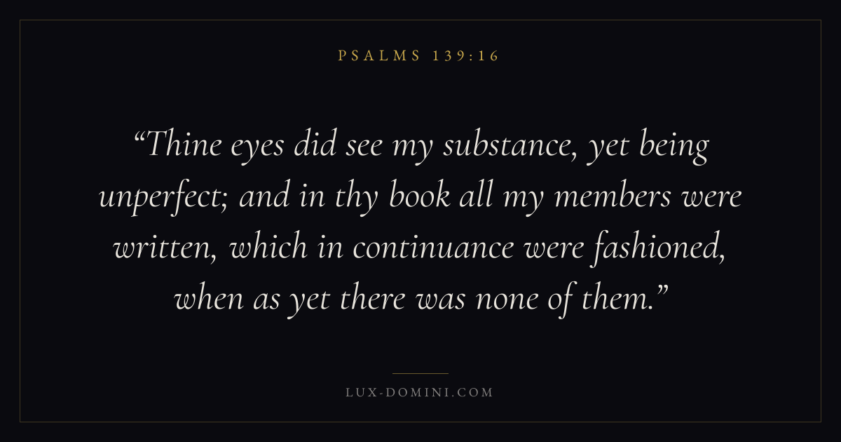 Thine eyes did see my substance, yet being unperfect; and in thy book all my members were written, which in continuance were fashioned, when as yet there was none of them.