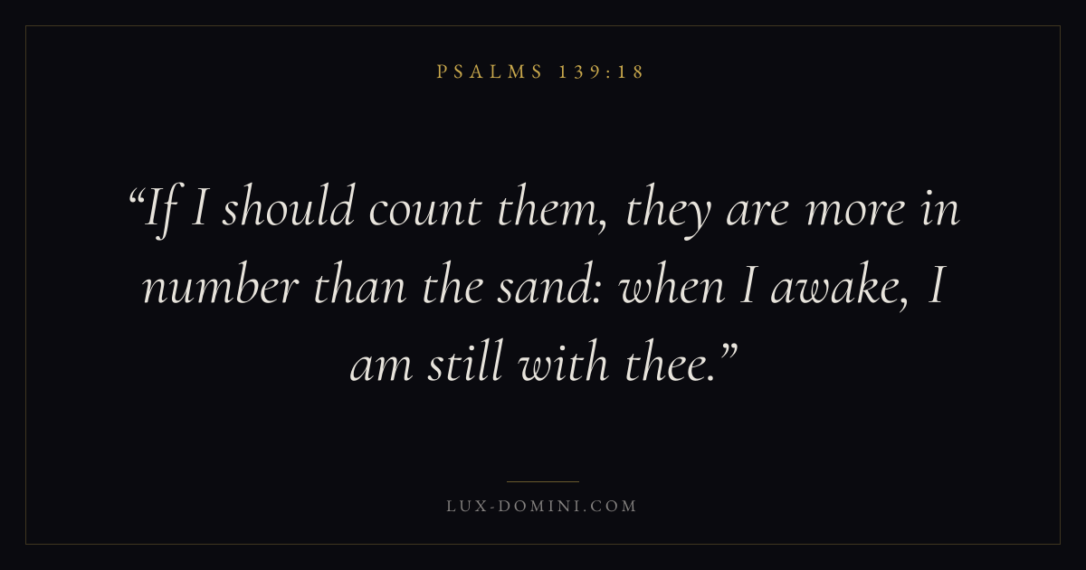 Books / Psalms / Chapter 139 / Verse 18 ← Psalms 139:17 Psalms 139:18 Psalms 139:19 → If I should count them, they are more in number than the sand: when I awake, I am still with thee. Download verse card Share on Twitter Share on Facebook Pin it ✦ Key themes FaithPrayerPeacePraise Read with Hebrews 11:1Romans 10:17Matthew 6:9Luke 18:1 Related topics Bible verses about faithBible verses about prayerBible verses about peaceBible verses about thankfulness and gratitude ✦ Psalms Chapter 139 verses V. 1 V. 2 V. 3 V. 4 V. 5 V. 6 V. 7 V. 8 V. 9 V. 10 V. 11 V. 12 V. 13 V. 14 V. 15 V. 16 V. 17 V. 18 V. 19 V. 20 V. 21 V. 22 V. 23 V. 24