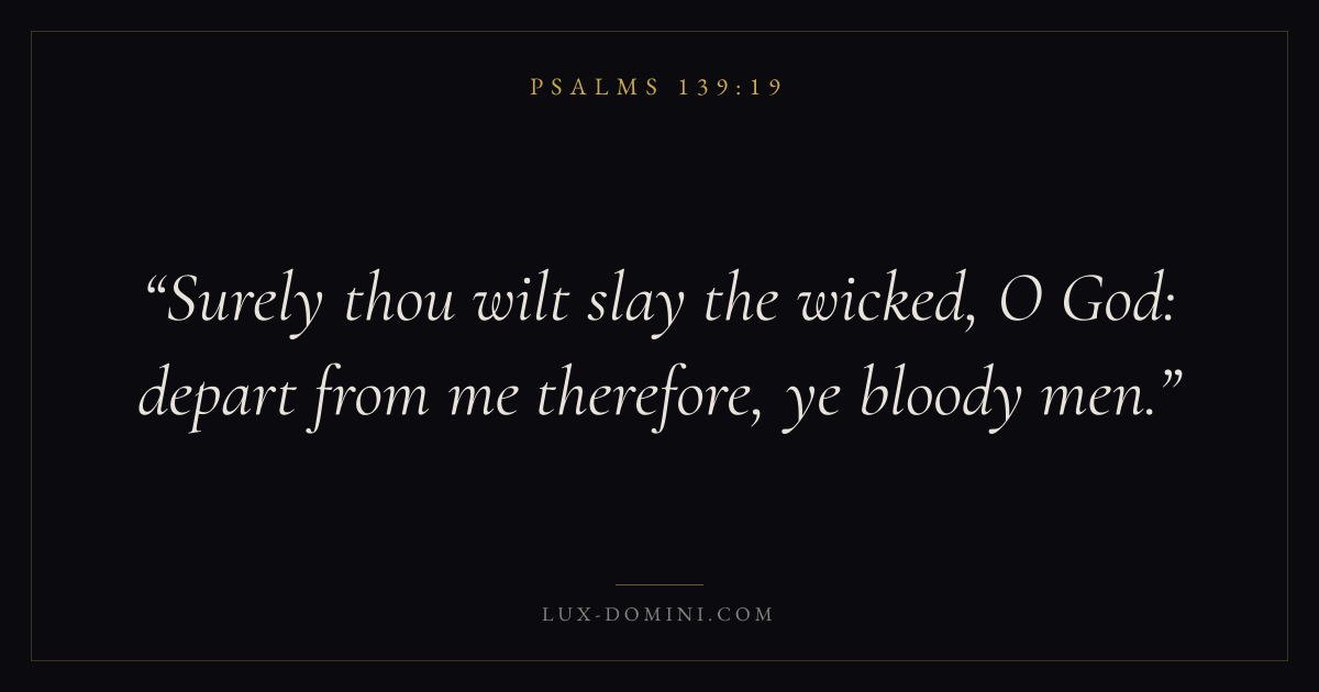 Books / Psalms / Chapter 139 / Verse 19 ← Psalms 139:18 Psalms 139:19 Psalms 139:20 → Surely thou wilt slay the wicked, O God: depart from me therefore, ye bloody men. Download verse card Share on Twitter Share on Facebook Pin it ✦ Key themes FaithPrayerPraiseLament Read with Hebrews 11:1Romans 10:17Matthew 6:9Luke 18:1 Related topics Bible verses about faithBible verses about prayerBible verses about thankfulness and gratitudeBible verses about grief and loss ✦ Psalms Chapter 139 verses V. 1 V. 2 V. 3 V. 4 V. 5 V. 6 V. 7 V. 8 V. 9 V. 10 V. 11 V. 12 V. 13 V. 14 V. 15 V. 16 V. 17 V. 18 V. 19 V. 20 V. 21 V. 22 V. 23 V. 24