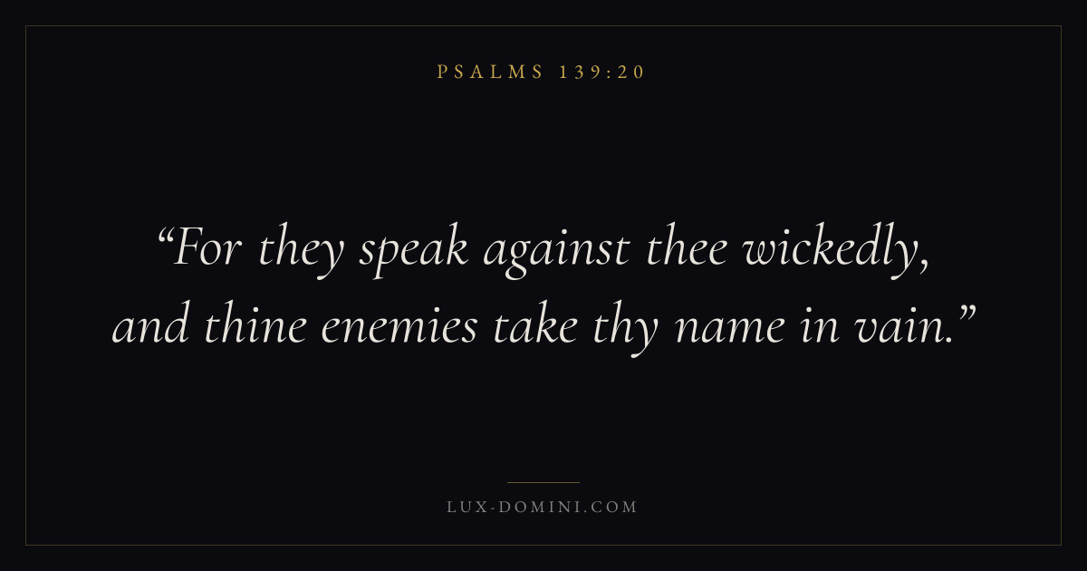 Books / Psalms / Chapter 139 / Verse 20 ← Psalms 139:19 Psalms 139:20 Psalms 139:21 → For they speak against thee wickedly, and thine enemies take thy name in vain. Download verse card Share on Twitter Share on Facebook Pin it ✦ Key themes FaithPrayerPraiseLament Read with Hebrews 11:1Romans 10:17Matthew 6:9Luke 18:1 Related topics Bible verses about faithBible verses about prayerBible verses about thankfulness and gratitudeBible verses about grief and loss ✦ Psalms Chapter 139 verses V. 1 V. 2 V. 3 V. 4 V. 5 V. 6 V. 7 V. 8 V. 9 V. 10 V. 11 V. 12 V. 13 V. 14 V. 15 V. 16 V. 17 V. 18 V. 19 V. 20 V. 21 V. 22 V. 23 V. 24