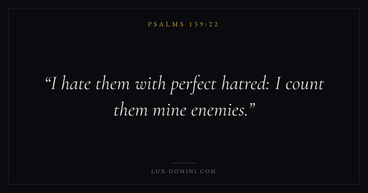 Books / Psalms / Chapter 139 / Verse 22 ← Psalms 139:21 Psalms 139:22 Psalms 139:23 → I hate them with perfect hatred: I count them mine enemies. Download verse card Share on Twitter Share on Facebook Pin it ✦ Key themes FaithPrayerPraiseLament Read with Hebrews 11:1Romans 10:17Matthew 6:9Luke 18:1 Related topics Bible verses about faithBible verses about prayerBible verses about thankfulness and gratitudeBible verses about grief and loss ✦ Psalms Chapter 139 verses V. 1 V. 2 V. 3 V. 4 V. 5 V. 6 V. 7 V. 8 V. 9 V. 10 V. 11 V. 12 V. 13 V. 14 V. 15 V. 16 V. 17 V. 18 V. 19 V. 20 V. 21 V. 22 V. 23 V. 24
