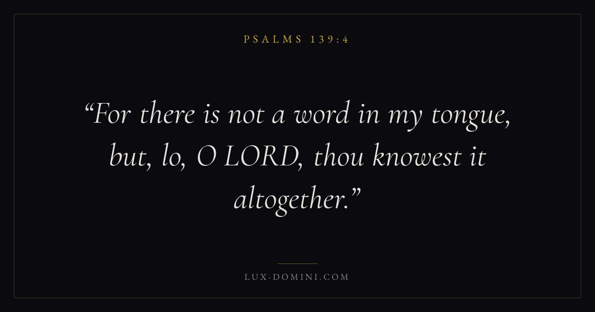 Books / Psalms / Chapter 139 / Verse 4 ← Psalms 139:3 Psalms 139:4 Psalms 139:5 → For there is not a word in my tongue, but, lo, O LORD, thou knowest it altogether. Download verse card Share on Twitter Share on Facebook Pin it ✦ Key themes FaithPrayerWisdomTruthPraise Read with Hebrews 11:1Romans 10:17Matthew 6:9Luke 18:1 Related topics Bible verses about faithBible verses about prayerBible verses about wisdomBible verses about truthBible verses about thankfulness and gratitude ✦ Psalms Chapter 139 verses V. 1 V. 2 V. 3 V. 4 V. 5 V. 6 V. 7 V. 8 V. 9 V. 10 V. 11 V. 12 V. 13 V. 14 V. 15 V. 16 V. 17 V. 18 V. 19 V. 20 V. 21 V. 22 V. 23 V. 24