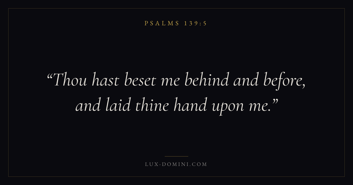 Books / Psalms / Chapter 139 / Verse 5 ← Psalms 139:4 Psalms 139:5 Psalms 139:6 → Thou hast beset me behind and before, and laid thine hand upon me. Download verse card Share on Twitter Share on Facebook Pin it ✦ Key themes FaithPrayerWisdomPraise Read with Hebrews 11:1Romans 10:17Matthew 6:9Luke 18:1 Related topics Bible verses about faithBible verses about prayerBible verses about wisdomBible verses about thankfulness and gratitude ✦ Psalms Chapter 139 verses V. 1 V. 2 V. 3 V. 4 V. 5 V. 6 V. 7 V. 8 V. 9 V. 10 V. 11 V. 12 V. 13 V. 14 V. 15 V. 16 V. 17 V. 18 V. 19 V. 20 V. 21 V. 22 V. 23 V. 24