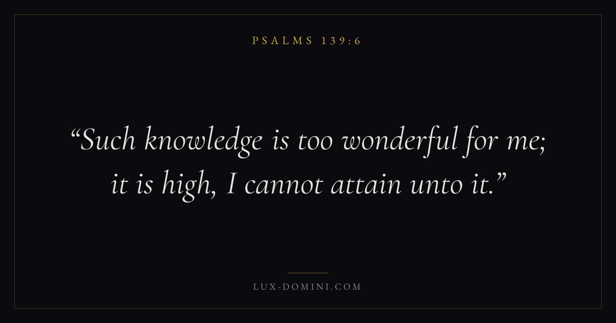Books / Psalms / Chapter 139 / Verse 6 ← Psalms 139:5 Psalms 139:6 Psalms 139:7 → Such knowledge is too wonderful for me; it is high, I cannot attain unto it. Download verse card Share on Twitter Share on Facebook Pin it ✦ Key themes FaithPrayerWisdomPraise Read with Hebrews 11:1Romans 10:17Matthew 6:9Luke 18:1 Related topics Bible verses about faithBible verses about prayerBible verses about wisdomBible verses about thankfulness and gratitude ✦ Psalms Chapter 139 verses V. 1 V. 2 V. 3 V. 4 V. 5 V. 6 V. 7 V. 8 V. 9 V. 10 V. 11 V. 12 V. 13 V. 14 V. 15 V. 16 V. 17 V. 18 V. 19 V. 20 V. 21 V. 22 V. 23 V. 24