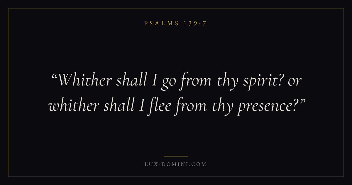 Books / Psalms / Chapter 139 / Verse 7 ← Psalms 139:6 Psalms 139:7 Psalms 139:8 → Whither shall I go from thy spirit? or whither shall I flee from thy presence? Download verse card Share on Twitter Share on Facebook Pin it ✦ Key themes FaithPrayerPraiseLament Read with Hebrews 11:1Romans 10:17Matthew 6:9Luke 18:1 Related topics Bible verses about faithBible verses about prayerBible verses about thankfulness and gratitudeBible verses about grief and loss ✦ Psalms Chapter 139 verses V. 1 V. 2 V. 3 V. 4 V. 5 V. 6 V. 7 V. 8 V. 9 V. 10 V. 11 V. 12 V. 13 V. 14 V. 15 V. 16 V. 17 V. 18 V. 19 V. 20 V. 21 V. 22 V. 23 V. 24