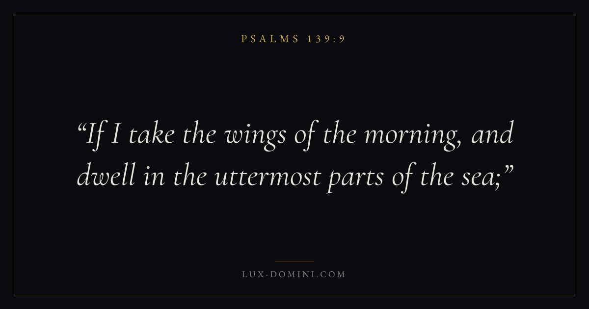 Books / Psalms / Chapter 139 / Verse 9 ← Psalms 139:8 Psalms 139:9 Psalms 139:10 → If I take the wings of the morning, and dwell in the uttermost parts of the sea; Download verse card Share on Twitter Share on Facebook Pin it ✦ Key themes FaithPrayerPraiseLament Read with Hebrews 11:1Romans 10:17Matthew 6:9Luke 18:1 Related topics Bible verses about faithBible verses about prayerBible verses about thankfulness and gratitudeBible verses about grief and loss ✦ Psalms Chapter 139 verses V. 1 V. 2 V. 3 V. 4 V. 5 V. 6 V. 7 V. 8 V. 9 V. 10 V. 11 V. 12 V. 13 V. 14 V. 15 V. 16 V. 17 V. 18 V. 19 V. 20 V. 21 V. 22 V. 23 V. 24