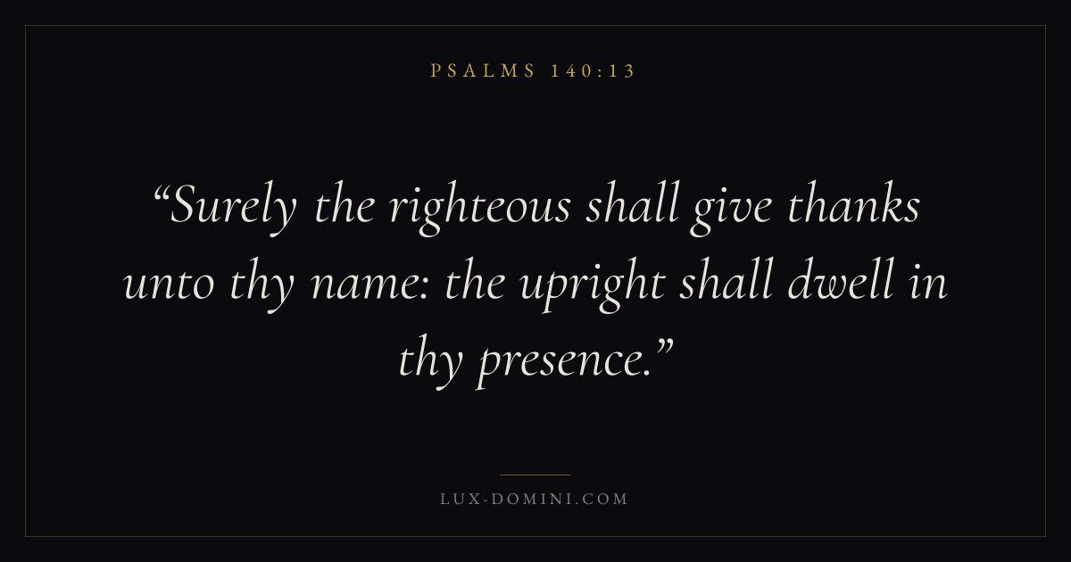 Books / Psalms / Chapter 140 / Verse 13 ← Psalms 140:12 Psalms 140:13 Psalms 141:1 → Surely the righteous shall give thanks unto thy name: the upright shall dwell in thy presence. Download verse card Share on Twitter Share on Facebook Pin it ✦ Key themes FaithPrayerPraiseLament Read with Hebrews 11:1Romans 10:17Matthew 6:9Luke 18:1 Related topics Bible verses about faithBible verses about prayerBible verses about thankfulness and gratitudeBible verses about grief and loss ✦ Psalms Chapter 140 verses V. 1 V. 2 V. 3 V. 4 V. 5 V. 6 V. 7 V. 8 V. 9 V. 10 V. 11 V. 12 V. 13