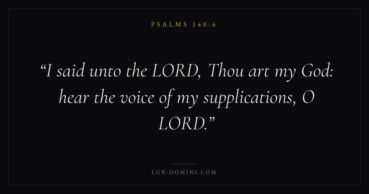 Books / Psalms / Chapter 140 / Verse 6 ← Psalms 140:5 Psalms 140:6 Psalms 140:7 → I said unto the LORD, Thou art my God: hear the voice of my supplications, O LORD. Download verse card Share on Twitter Share on Facebook Pin it ✦ Key themes FaithPrayerPraiseLament Read with Hebrews 11:1Romans 10:17Matthew 6:9Luke 18:1 Related topics Bible verses about faithBible verses about prayerBible verses about thankfulness and gratitudeBible verses about grief and loss ✦ Psalms Chapter 140 verses V. 1 V. 2 V. 3 V. 4 V. 5 V. 6 V. 7 V. 8 V. 9 V. 10 V. 11 V. 12 V. 13