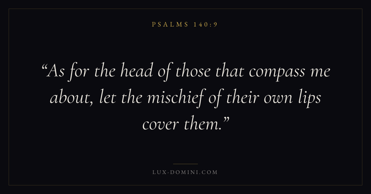 Books / Psalms / Chapter 140 / Verse 9 ← Psalms 140:8 Psalms 140:9 Psalms 140:10 → As for the head of those that compass me about, let the mischief of their own lips cover them. Download verse card Share on Twitter Share on Facebook Pin it ✦ Key themes FaithPrayerPraiseLament Read with Hebrews 11:1Romans 10:17Matthew 6:9Luke 18:1 Related topics Bible verses about faithBible verses about prayerBible verses about thankfulness and gratitudeBible verses about grief and loss ✦ Psalms Chapter 140 verses V. 1 V. 2 V. 3 V. 4 V. 5 V. 6 V. 7 V. 8 V. 9 V. 10 V. 11 V. 12 V. 13