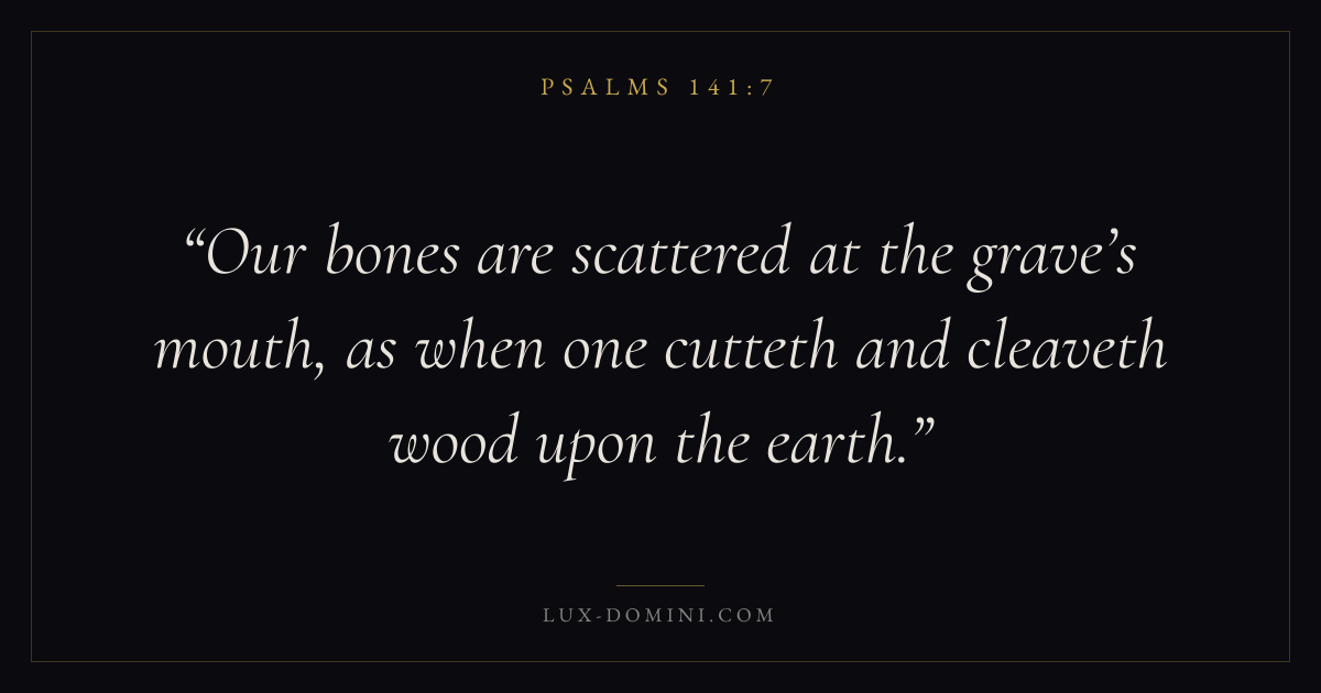 Books / Psalms / Chapter 141 / Verse 7 ← Psalms 141:6 Psalms 141:7 Psalms 141:8 → Our bones are scattered at the grave’s mouth, as when one cutteth and cleaveth wood upon the earth. Download verse card Share on Twitter Share on Facebook Pin it ✦ Key themes FaithPrayerPraiseLament Read with Hebrews 11:1Romans 10:17Matthew 6:9Luke 18:1 Related topics Bible verses about faithBible verses about prayerBible verses about thankfulness and gratitudeBible verses about grief and loss ✦ Psalms Chapter 141 verses V. 1 V. 2 V. 3 V. 4 V. 5 V. 6 V. 7 V. 8 V. 9 V. 10