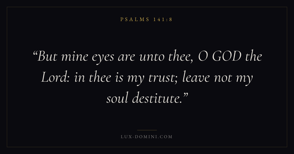 Books / Psalms / Chapter 141 / Verse 8 ← Psalms 141:7 Psalms 141:8 Psalms 141:9 → But mine eyes are unto thee, O GOD the Lord: in thee is my trust; leave not my soul destitute. Download verse card Share on Twitter Share on Facebook Pin it ✦ Key themes FaithPrayerPraiseLament Read with Hebrews 11:1Romans 10:17Matthew 6:9Luke 18:1 Related topics Bible verses about faithBible verses about prayerBible verses about thankfulness and gratitudeBible verses about grief and loss ✦ Psalms Chapter 141 verses V. 1 V. 2 V. 3 V. 4 V. 5 V. 6 V. 7 V. 8 V. 9 V. 10