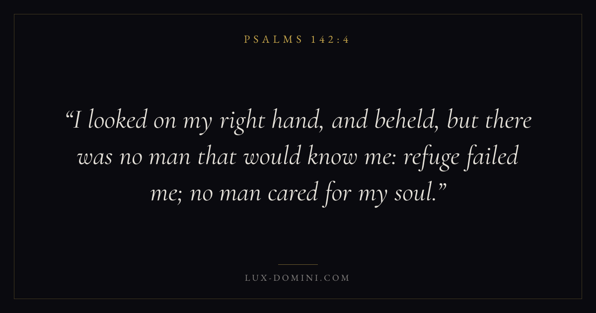 I looked on my right hand, and beheld, but there was no man that would know me: refuge failed me; no man cared for my soul.