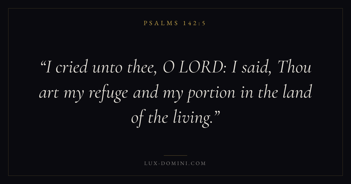 Books / Psalms / Chapter 142 / Verse 5 ← Psalms 142:4 Psalms 142:5 Psalms 142:6 → I cried unto thee, O LORD: I said, Thou art my refuge and my portion in the land of the living. Download verse card Share on Twitter Share on Facebook Pin it ✦ Key themes FaithPrayerPraiseLament Read with Hebrews 11:1Romans 10:17Matthew 6:9Luke 18:1 Related topics Bible verses about faithBible verses about prayerBible verses about thankfulness and gratitudeBible verses about grief and loss ✦ Psalms Chapter 142 verses V. 1 V. 2 V. 3 V. 4 V. 5 V. 6 V. 7