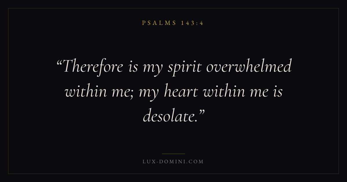 Books / Psalms / Chapter 143 / Verse 4 ← Psalms 143:3 Psalms 143:4 Psalms 143:5 → Therefore is my spirit overwhelmed within me; my heart within me is desolate. Download verse card Share on Twitter Share on Facebook Pin it ✦ Key themes FaithHopePrayerJustice and mercyPraise Read with Hebrews 11:1Romans 10:17Romans 8:24Revelation 21:4 Related topics Bible verses about faithBible verses about hopeBible verses about prayerBible verses about justice and mercyBible verses about thankfulness and gratitude ✦ Psalms Chapter 143 verses V. 1 V. 2 V. 3 V. 4 V. 5 V. 6 V. 7 V. 8 V. 9 V. 10 V. 11 V. 12