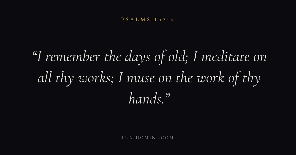 Books / Psalms / Chapter 143 / Verse 5 ← Psalms 143:4 Psalms 143:5 Psalms 143:6 → I remember the days of old; I meditate on all thy works; I muse on the work of thy hands. Download verse card Share on Twitter Share on Facebook Pin it ✦ Key themes FaithHopePrayerJustice and mercyPraise Read with Hebrews 11:1Romans 10:17Romans 8:24Revelation 21:4 Related topics Bible verses about faithBible verses about hopeBible verses about prayerBible verses about justice and mercyBible verses about thankfulness and gratitude ✦ Psalms Chapter 143 verses V. 1 V. 2 V. 3 V. 4 V. 5 V. 6 V. 7 V. 8 V. 9 V. 10 V. 11 V. 12