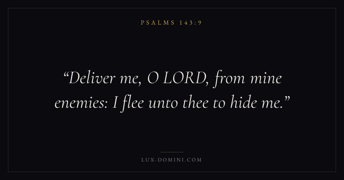Books / Psalms / Chapter 143 / Verse 9 ← Psalms 143:8 Psalms 143:9 Psalms 143:10 → Deliver me, O LORD, from mine enemies: I flee unto thee to hide me. Download verse card Share on Twitter Share on Facebook Pin it ✦ Key themes FaithPrayerPraiseLament Read with Hebrews 11:1Romans 10:17Matthew 6:9Luke 18:1 Related topics Bible verses about faithBible verses about prayerBible verses about thankfulness and gratitudeBible verses about grief and loss ✦ Psalms Chapter 143 verses V. 1 V. 2 V. 3 V. 4 V. 5 V. 6 V. 7 V. 8 V. 9 V. 10 V. 11 V. 12