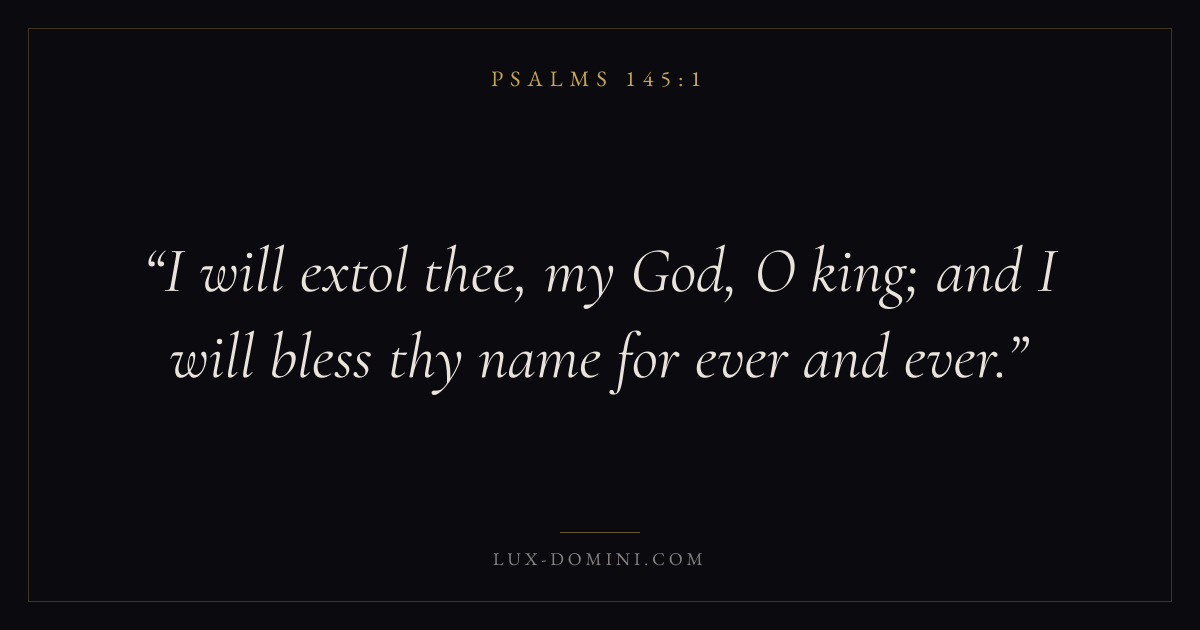 Books / Psalms / Chapter 145 / Verse 1 ← Psalms 144:15 Psalms 145:1 Psalms 145:2 → I will extol thee, my God, O king; and I will bless thy name for ever and ever. Download verse card Share on Twitter Share on Facebook Pin it ✦ Key themes FaithPrayerTruthPraise Read with Hebrews 11:1Romans 10:17Matthew 6:9Luke 18:1 Related topics Bible verses about faithBible verses about prayerBible verses about truthBible verses about thankfulness and gratitude ✦ Psalms Chapter 145 verses V. 1 V. 2 V. 3 V. 4 V. 5 V. 6 V. 7 V. 8 V. 9 V. 10 V. 11 V. 12 V. 13 V. 14 V. 15 V. 16 V. 17 V. 18 V. 19 V. 20 V. 21