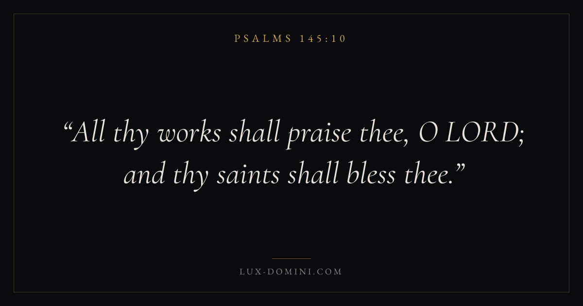 Books / Psalms / Chapter 145 / Verse 10 ← Psalms 145:9 Psalms 145:10 Psalms 145:11 → All thy works shall praise thee, O LORD; and thy saints shall bless thee. Download verse card Share on Twitter Share on Facebook Pin it ✦ Key themes FaithPrayerPraiseLament Read with Hebrews 11:1Romans 10:17Matthew 6:9Luke 18:1 Related topics Bible verses about faithBible verses about prayerBible verses about thankfulness and gratitudeBible verses about grief and loss ✦ Psalms Chapter 145 verses V. 1 V. 2 V. 3 V. 4 V. 5 V. 6 V. 7 V. 8 V. 9 V. 10 V. 11 V. 12 V. 13 V. 14 V. 15 V. 16 V. 17 V. 18 V. 19 V. 20 V. 21