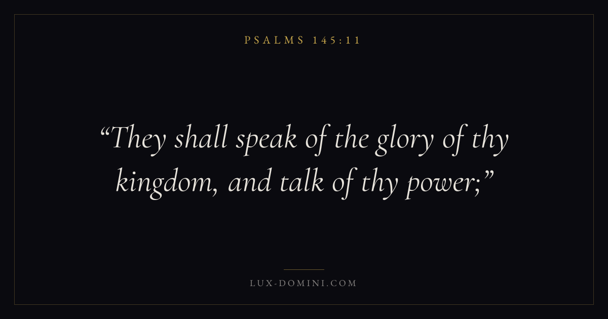 Books / Psalms / Chapter 145 / Verse 11 ← Psalms 145:10 Psalms 145:11 Psalms 145:12 → They shall speak of the glory of thy kingdom, and talk of thy power; Download verse card Share on Twitter Share on Facebook Pin it ✦ Key themes FaithPrayerPraiseLament Read with Hebrews 11:1Romans 10:17Matthew 6:9Luke 18:1 Related topics Bible verses about faithBible verses about prayerBible verses about thankfulness and gratitudeBible verses about grief and loss ✦ Psalms Chapter 145 verses V. 1 V. 2 V. 3 V. 4 V. 5 V. 6 V. 7 V. 8 V. 9 V. 10 V. 11 V. 12 V. 13 V. 14 V. 15 V. 16 V. 17 V. 18 V. 19 V. 20 V. 21