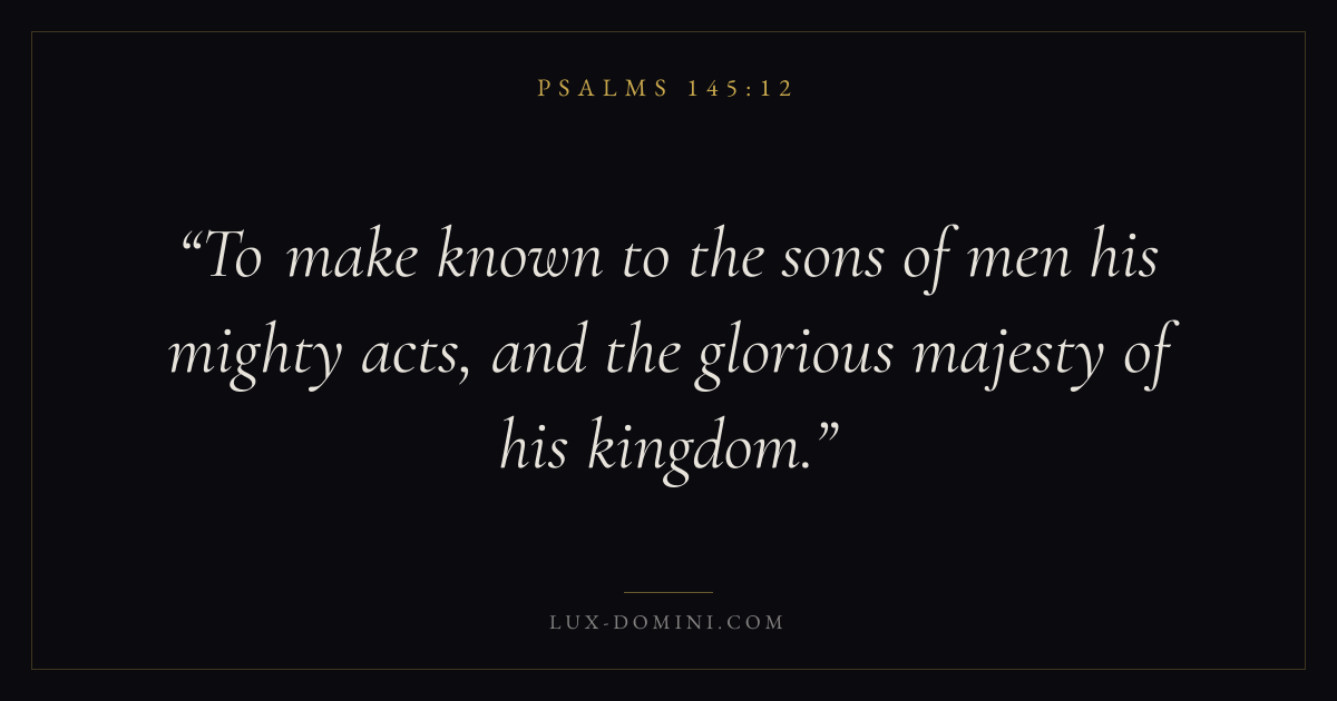 Books / Psalms / Chapter 145 / Verse 12 ← Psalms 145:11 Psalms 145:12 Psalms 145:13 → To make known to the sons of men his mighty acts, and the glorious majesty of his kingdom. Download verse card Share on Twitter Share on Facebook Pin it ✦ Key themes FaithPrayerPraiseLament Read with Hebrews 11:1Romans 10:17Matthew 6:9Luke 18:1 Related topics Bible verses about faithBible verses about prayerBible verses about thankfulness and gratitudeBible verses about grief and loss ✦ Psalms Chapter 145 verses V. 1 V. 2 V. 3 V. 4 V. 5 V. 6 V. 7 V. 8 V. 9 V. 10 V. 11 V. 12 V. 13 V. 14 V. 15 V. 16 V. 17 V. 18 V. 19 V. 20 V. 21