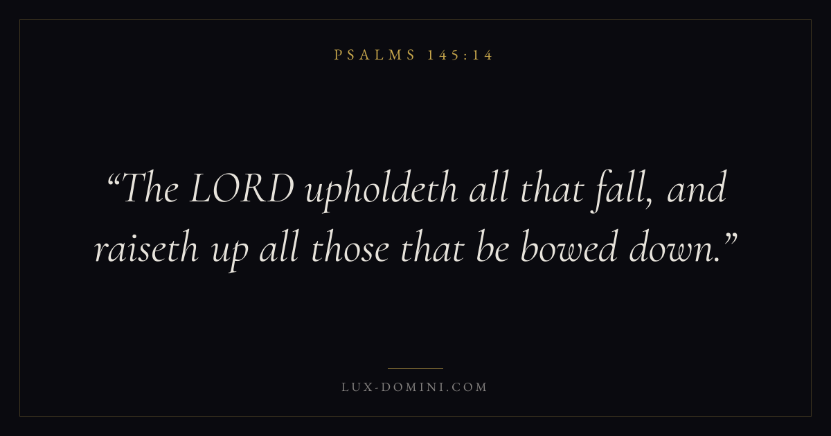 Books / Psalms / Chapter 145 / Verse 14 ← Psalms 145:13 Psalms 145:14 Psalms 145:15 → The LORD upholdeth all that fall, and raiseth up all those that be bowed down. Download verse card Share on Twitter Share on Facebook Pin it ✦ Key themes FaithPrayerPraiseLament Read with Hebrews 11:1Romans 10:17Matthew 6:9Luke 18:1 Related topics Bible verses about faithBible verses about prayerBible verses about thankfulness and gratitudeBible verses about grief and loss ✦ Psalms Chapter 145 verses V. 1 V. 2 V. 3 V. 4 V. 5 V. 6 V. 7 V. 8 V. 9 V. 10 V. 11 V. 12 V. 13 V. 14 V. 15 V. 16 V. 17 V. 18 V. 19 V. 20 V. 21
