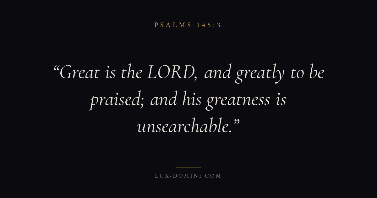 Books / Psalms / Chapter 145 / Verse 3 ← Psalms 145:2 Psalms 145:3 Psalms 145:4 → Great is the LORD, and greatly to be praised; and his greatness is unsearchable. Download verse card Share on Twitter Share on Facebook Pin it ✦ Key themes FaithPrayerTruthPraise Read with Hebrews 11:1Romans 10:17Matthew 6:9Luke 18:1 Related topics Bible verses about faithBible verses about prayerBible verses about truthBible verses about thankfulness and gratitude ✦ Psalms Chapter 145 verses V. 1 V. 2 V. 3 V. 4 V. 5 V. 6 V. 7 V. 8 V. 9 V. 10 V. 11 V. 12 V. 13 V. 14 V. 15 V. 16 V. 17 V. 18 V. 19 V. 20 V. 21