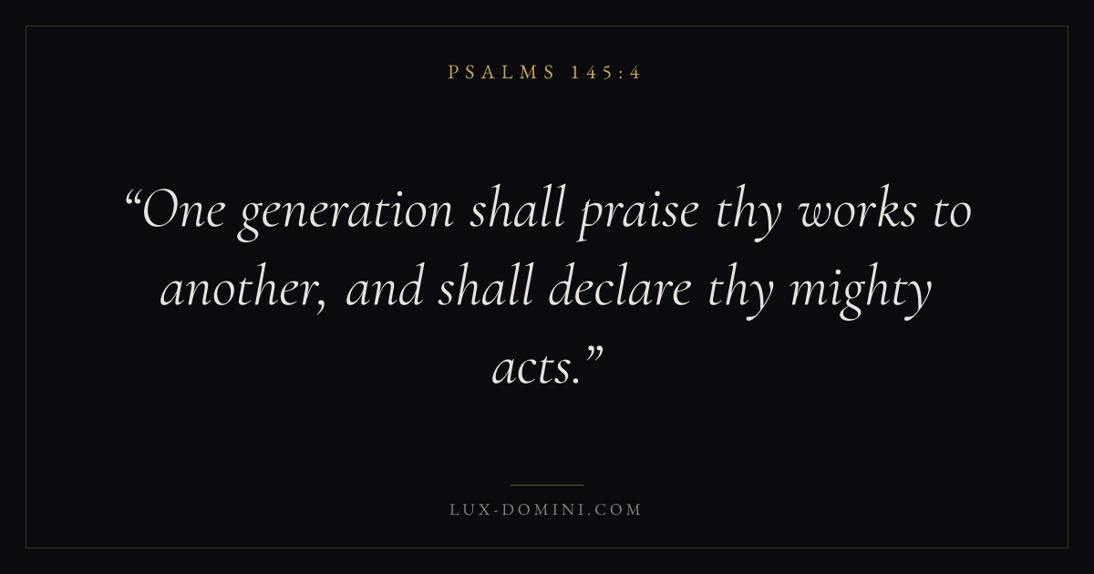 Books / Psalms / Chapter 145 / Verse 4 ← Psalms 145:3 Psalms 145:4 Psalms 145:5 → One generation shall praise thy works to another, and shall declare thy mighty acts. Download verse card Share on Twitter Share on Facebook Pin it ✦ Key themes FaithPrayerTruthPraise Read with Hebrews 11:1Romans 10:17Matthew 6:9Luke 18:1 Related topics Bible verses about faithBible verses about prayerBible verses about truthBible verses about thankfulness and gratitude ✦ Psalms Chapter 145 verses V. 1 V. 2 V. 3 V. 4 V. 5 V. 6 V. 7 V. 8 V. 9 V. 10 V. 11 V. 12 V. 13 V. 14 V. 15 V. 16 V. 17 V. 18 V. 19 V. 20 V. 21