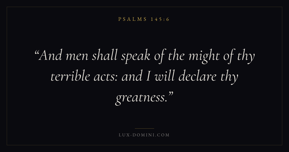 Books / Psalms / Chapter 145 / Verse 6 ← Psalms 145:5 Psalms 145:6 Psalms 145:7 → And men shall speak of the might of thy terrible acts: and I will declare thy greatness. Download verse card Share on Twitter Share on Facebook Pin it ✦ Key themes FaithPrayerTruthPraise Read with Hebrews 11:1Romans 10:17Matthew 6:9Luke 18:1 Related topics Bible verses about faithBible verses about prayerBible verses about truthBible verses about thankfulness and gratitude ✦ Psalms Chapter 145 verses V. 1 V. 2 V. 3 V. 4 V. 5 V. 6 V. 7 V. 8 V. 9 V. 10 V. 11 V. 12 V. 13 V. 14 V. 15 V. 16 V. 17 V. 18 V. 19 V. 20 V. 21
