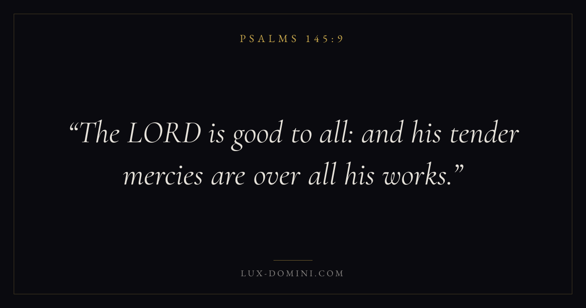 Books / Psalms / Chapter 145 / Verse 9 ← Psalms 145:8 Psalms 145:9 Psalms 145:10 → The LORD is good to all: and his tender mercies are over all his works. Download verse card Share on Twitter Share on Facebook Pin it ✦ Key themes FaithPrayerTruthPraise Read with Hebrews 11:1Romans 10:17Matthew 6:9Luke 18:1 Related topics Bible verses about faithBible verses about prayerBible verses about truthBible verses about thankfulness and gratitude ✦ Psalms Chapter 145 verses V. 1 V. 2 V. 3 V. 4 V. 5 V. 6 V. 7 V. 8 V. 9 V. 10 V. 11 V. 12 V. 13 V. 14 V. 15 V. 16 V. 17 V. 18 V. 19 V. 20 V. 21