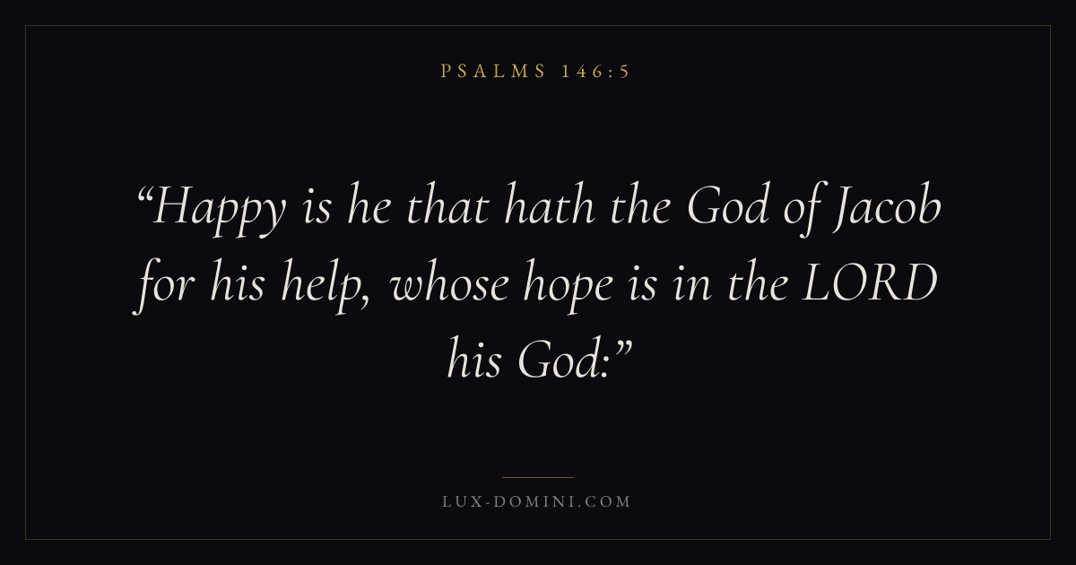 Books / Psalms / Chapter 146 / Verse 5 ← Psalms 146:4 Psalms 146:5 Psalms 146:6 → Happy is he that hath the God of Jacob for his help, whose hope is in the LORD his God: Download verse card Share on Twitter Share on Facebook Pin it ✦ Key themes FaithHopePrayerGracePraise Read with Hebrews 11:1Romans 10:17Romans 8:24Revelation 21:4 Related topics Bible verses about faithBible verses about hopeBible verses about prayerBible verses about graceBible verses about thankfulness and gratitude ✦ Psalms Chapter 146 verses V. 1 V. 2 V. 3 V. 4 V. 5 V. 6 V. 7 V. 8 V. 9 V. 10