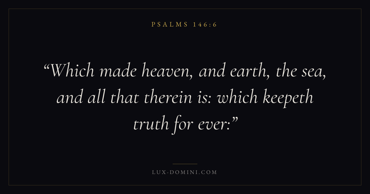 Books / Psalms / Chapter 146 / Verse 6 ← Psalms 146:5 Psalms 146:6 Psalms 146:7 → Which made heaven, and earth, the sea, and all that therein is: which keepeth truth for ever: Download verse card Share on Twitter Share on Facebook Pin it ✦ Key themes FaithHopePrayerGracePraise Read with Hebrews 11:1Romans 10:17Romans 8:24Revelation 21:4 Related topics Bible verses about faithBible verses about hopeBible verses about prayerBible verses about graceBible verses about thankfulness and gratitude ✦ Psalms Chapter 146 verses V. 1 V. 2 V. 3 V. 4 V. 5 V. 6 V. 7 V. 8 V. 9 V. 10