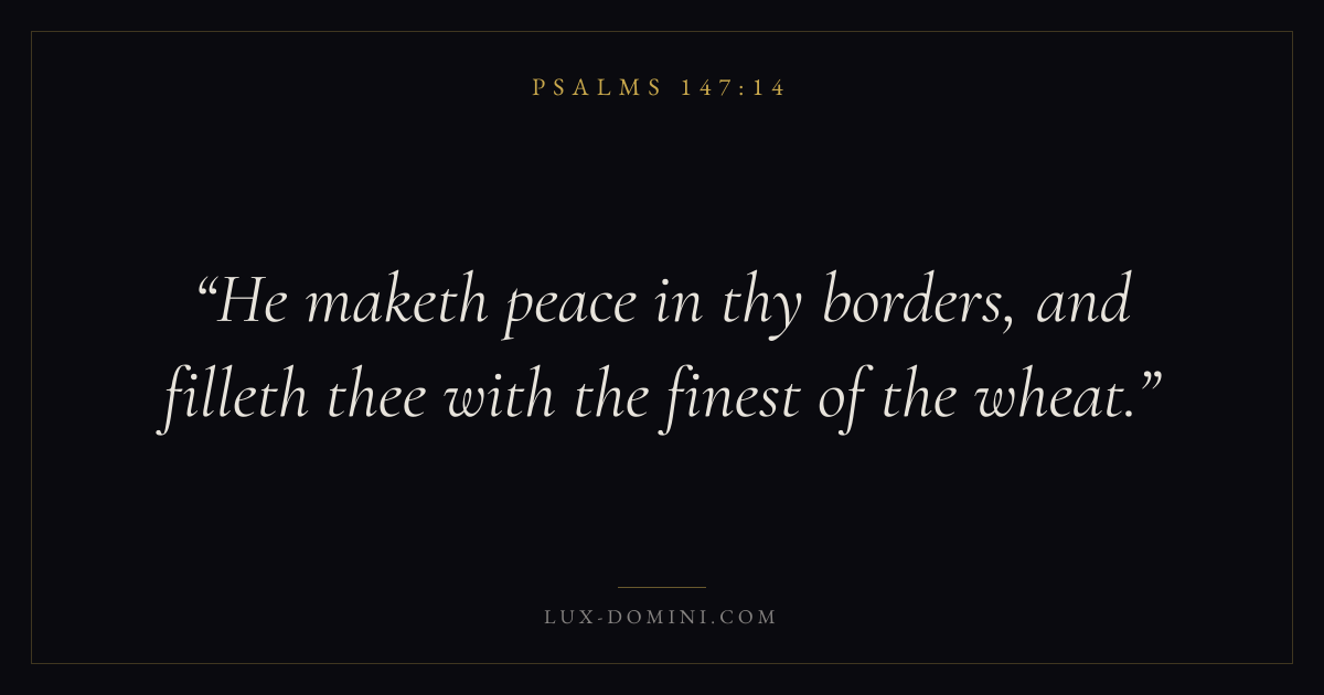 Books / Psalms / Chapter 147 / Verse 14 ← Psalms 147:13 Psalms 147:14 Psalms 147:15 → He maketh peace in thy borders, and filleth thee with the finest of the wheat. Download verse card Share on Twitter Share on Facebook Pin it ✦ Key themes FaithPrayerWisdomPeacePraise Read with Hebrews 11:1Romans 10:17Matthew 6:9Luke 18:1 Related topics Bible verses about faithBible verses about prayerBible verses about wisdomBible verses about peaceBible verses about thankfulness and gratitude ✦ Psalms Chapter 147 verses V. 1 V. 2 V. 3 V. 4 V. 5 V. 6 V. 7 V. 8 V. 9 V. 10 V. 11 V. 12 V. 13 V. 14 V. 15 V. 16 V. 17 V. 18 V. 19 V. 20