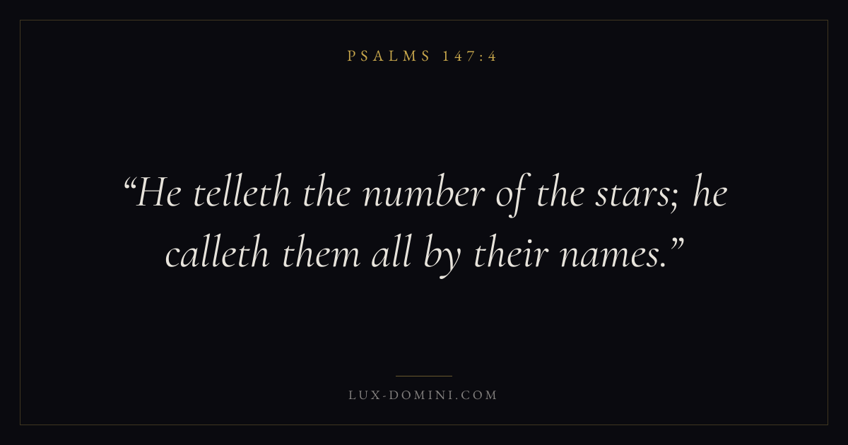 Books / Psalms / Chapter 147 / Verse 4 ← Psalms 147:3 Psalms 147:4 Psalms 147:5 → He telleth the number of the stars; he calleth them all by their names. Download verse card Share on Twitter Share on Facebook Pin it ✦ Key themes FaithPrayerPraiseLament Read with Hebrews 11:1Romans 10:17Matthew 6:9Luke 18:1 Related topics Bible verses about faithBible verses about prayerBible verses about thankfulness and gratitudeBible verses about grief and loss ✦ Psalms Chapter 147 verses V. 1 V. 2 V. 3 V. 4 V. 5 V. 6 V. 7 V. 8 V. 9 V. 10 V. 11 V. 12 V. 13 V. 14 V. 15 V. 16 V. 17 V. 18 V. 19 V. 20