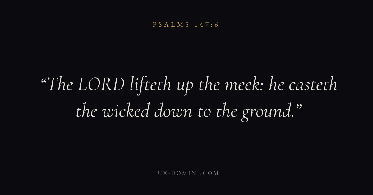 Books / Psalms / Chapter 147 / Verse 6 ← Psalms 147:5 Psalms 147:6 Psalms 147:7 → The LORD lifteth up the meek: he casteth the wicked down to the ground. Download verse card Share on Twitter Share on Facebook Pin it ✦ Key themes FaithPrayerHumilityPraise Read with Hebrews 11:1Romans 10:17Matthew 6:9Luke 18:1 Related topics Bible verses about faithBible verses about prayerBible verses about humilityBible verses about thankfulness and gratitude ✦ Psalms Chapter 147 verses V. 1 V. 2 V. 3 V. 4 V. 5 V. 6 V. 7 V. 8 V. 9 V. 10 V. 11 V. 12 V. 13 V. 14 V. 15 V. 16 V. 17 V. 18 V. 19 V. 20