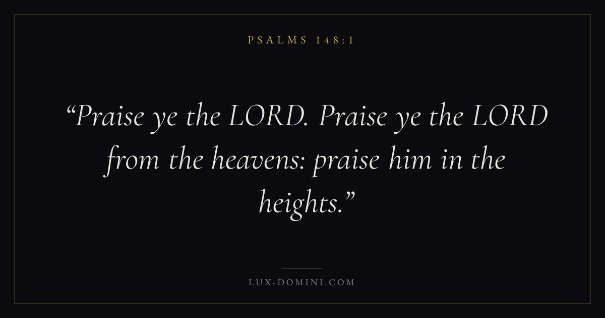 Books / Psalms / Chapter 148 / Verse 1 ← Psalms 147:20 Psalms 148:1 Psalms 148:2 → Praise ye the LORD. Praise ye the LORD from the heavens: praise him in the heights. Download verse card Share on Twitter Share on Facebook Pin it ✦ Key themes FaithPrayerPraiseLament Read with Hebrews 11:1Romans 10:17Matthew 6:9Luke 18:1 Related topics Bible verses about faithBible verses about prayerBible verses about thankfulness and gratitudeBible verses about grief and loss ✦ Psalms Chapter 148 verses V. 1 V. 2 V. 3 V. 4 V. 5 V. 6 V. 7 V. 8 V. 9 V. 10 V. 11 V. 12 V. 13 V. 14