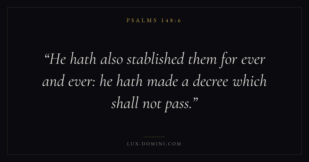 Books / Psalms / Chapter 148 / Verse 6 ← Psalms 148:5 Psalms 148:6 Psalms 148:7 → He hath also stablished them for ever and ever: he hath made a decree which shall not pass. Download verse card Share on Twitter Share on Facebook Pin it ✦ Key themes FaithPrayerPraiseLament Read with Hebrews 11:1Romans 10:17Matthew 6:9Luke 18:1 Related topics Bible verses about faithBible verses about prayerBible verses about thankfulness and gratitudeBible verses about grief and loss ✦ Psalms Chapter 148 verses V. 1 V. 2 V. 3 V. 4 V. 5 V. 6 V. 7 V. 8 V. 9 V. 10 V. 11 V. 12 V. 13 V. 14