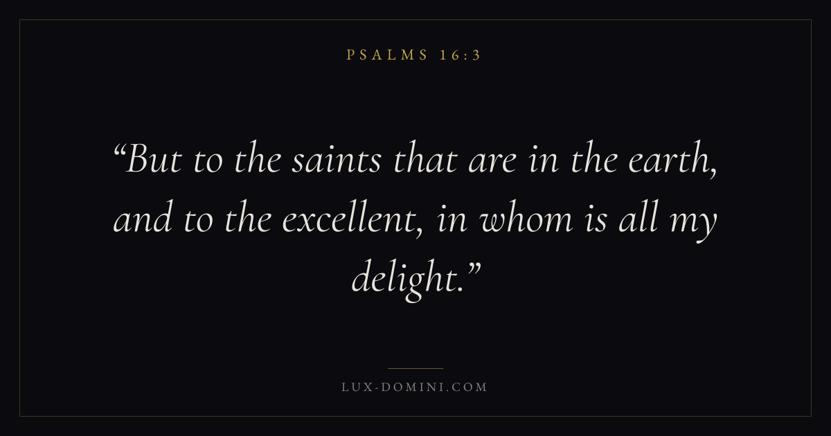 Books / Psalms / Chapter 16 / Verse 3 ← Psalms 16:2 Psalms 16:3 Psalms 16:4 → But to the saints that are in the earth, and to the excellent, in whom is all my delight. Download verse card Share on Twitter Share on Facebook Pin it ✦ Key themes FaithPrayerPraiseLament Read with Hebrews 11:1Romans 10:17Matthew 6:9Luke 18:1 Related topics Bible verses about faithBible verses about prayerBible verses about thankfulness and gratitudeBible verses about grief and loss ✦ Psalms Chapter 16 verses V. 1 V. 2 V. 3 V. 4 V. 5 V. 6 V. 7 V. 8 V. 9 V. 10 V. 11