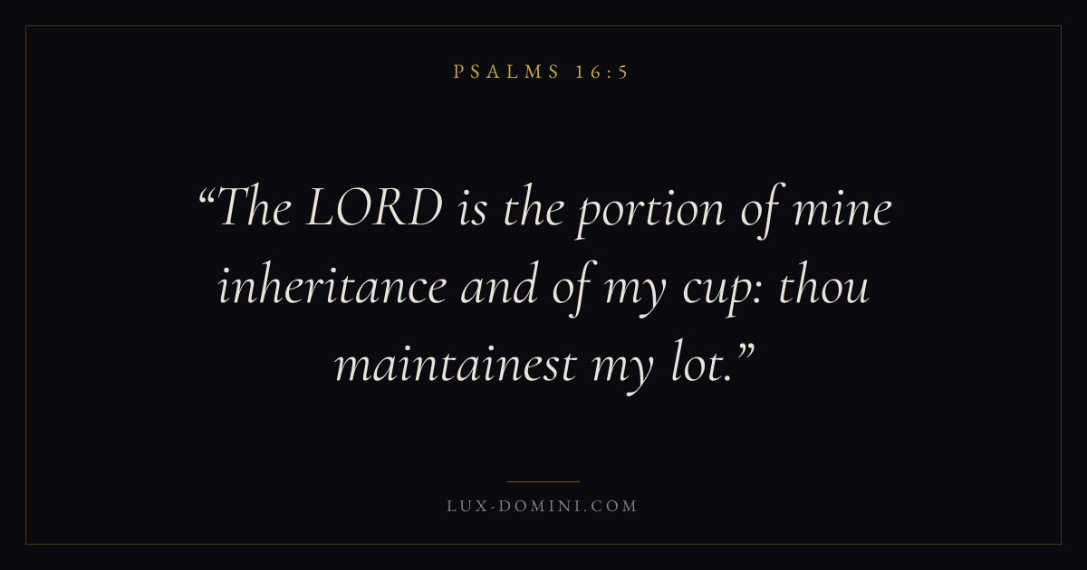 Books / Psalms / Chapter 16 / Verse 5 ← Psalms 16:4 Psalms 16:5 Psalms 16:6 → The LORD is the portion of mine inheritance and of my cup: thou maintainest my lot. Download verse card Share on Twitter Share on Facebook Pin it ✦ Key themes FaithPrayerPraiseLament Read with Hebrews 11:1Romans 10:17Matthew 6:9Luke 18:1 Related topics Bible verses about faithBible verses about prayerBible verses about thankfulness and gratitudeBible verses about grief and loss ✦ Psalms Chapter 16 verses V. 1 V. 2 V. 3 V. 4 V. 5 V. 6 V. 7 V. 8 V. 9 V. 10 V. 11