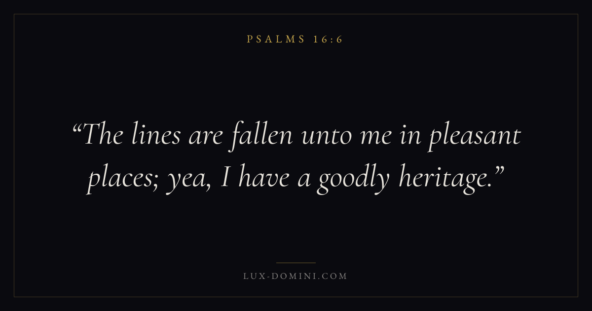 Books / Psalms / Chapter 16 / Verse 6 ← Psalms 16:5 Psalms 16:6 Psalms 16:7 → The lines are fallen unto me in pleasant places; yea, I have a goodly heritage. Download verse card Share on Twitter Share on Facebook Pin it ✦ Key themes FaithPrayerPraiseLament Read with Hebrews 11:1Romans 10:17Matthew 6:9Luke 18:1 Related topics Bible verses about faithBible verses about prayerBible verses about thankfulness and gratitudeBible verses about grief and loss ✦ Psalms Chapter 16 verses V. 1 V. 2 V. 3 V. 4 V. 5 V. 6 V. 7 V. 8 V. 9 V. 10 V. 11