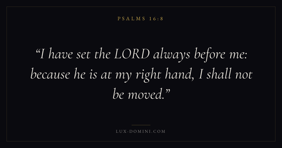 Books / Psalms / Chapter 16 / Verse 8 ← Psalms 16:7 Psalms 16:8 Psalms 16:9 → I have set the LORD always before me: because he is at my right hand, I shall not be moved. Download verse card Share on Twitter Share on Facebook Pin it ✦ Key themes FaithPrayerPraiseLament Read with Hebrews 11:1Romans 10:17Matthew 6:9Luke 18:1 Related topics Bible verses about faithBible verses about prayerBible verses about thankfulness and gratitudeBible verses about grief and loss ✦ Psalms Chapter 16 verses V. 1 V. 2 V. 3 V. 4 V. 5 V. 6 V. 7 V. 8 V. 9 V. 10 V. 11