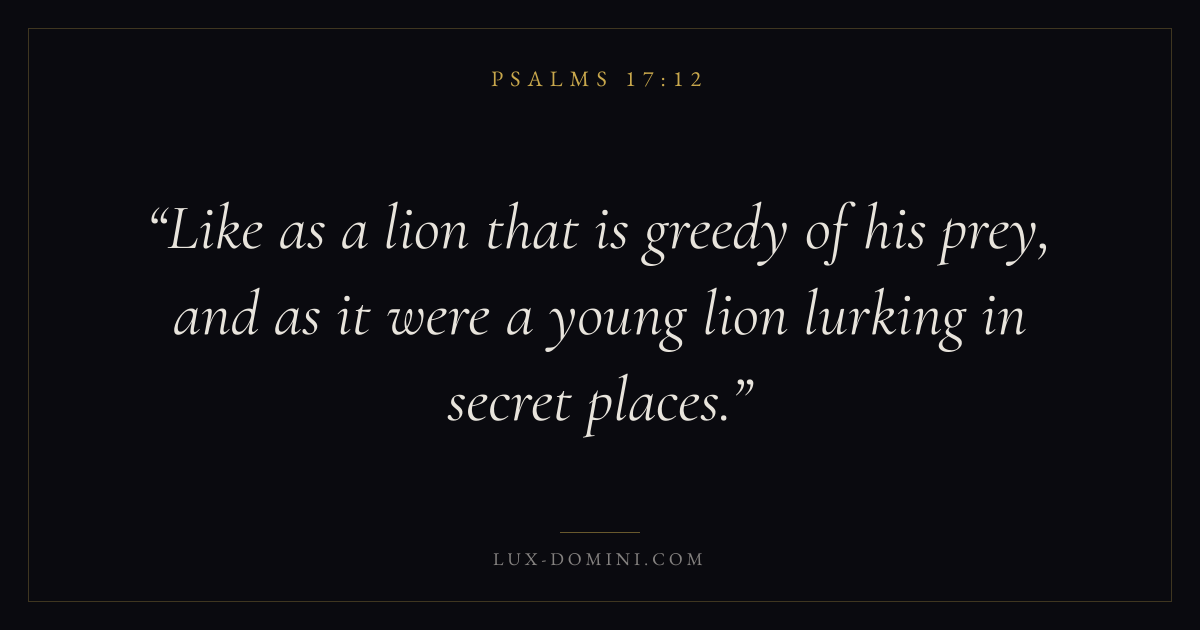 Books / Psalms / Chapter 17 / Verse 12 ← Psalms 17:11 Psalms 17:12 Psalms 17:13 → Like as a lion that is greedy of his prey, and as it were a young lion lurking in secret places. Download verse card Share on Twitter Share on Facebook Pin it ✦ Key themes FaithPrayerPraiseLament Read with Hebrews 11:1Romans 10:17Matthew 6:9Luke 18:1 Related topics Bible verses about faithBible verses about prayerBible verses about thankfulness and gratitudeBible verses about grief and loss ✦ Psalms Chapter 17 verses V. 1 V. 2 V. 3 V. 4 V. 5 V. 6 V. 7 V. 8 V. 9 V. 10 V. 11 V. 12 V. 13 V. 14 V. 15