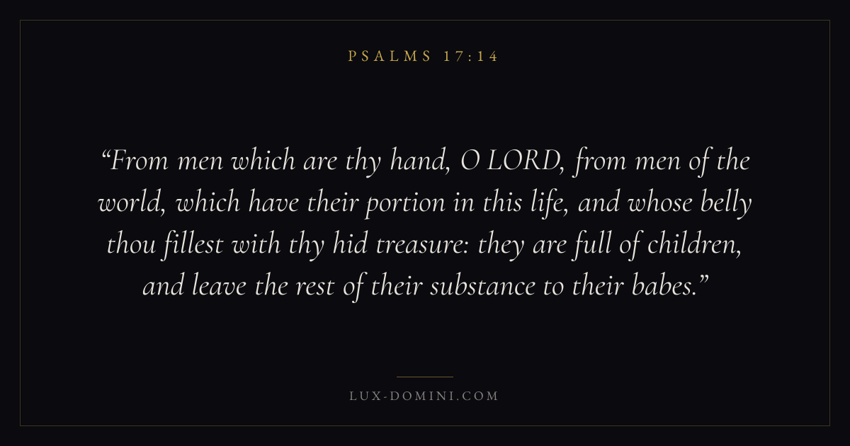 From men which are thy hand, O LORD, from men of the world, which have their portion in this life, and whose belly thou fillest with thy hid treasure: they are full of children, and leave the rest of their substance to their babes.