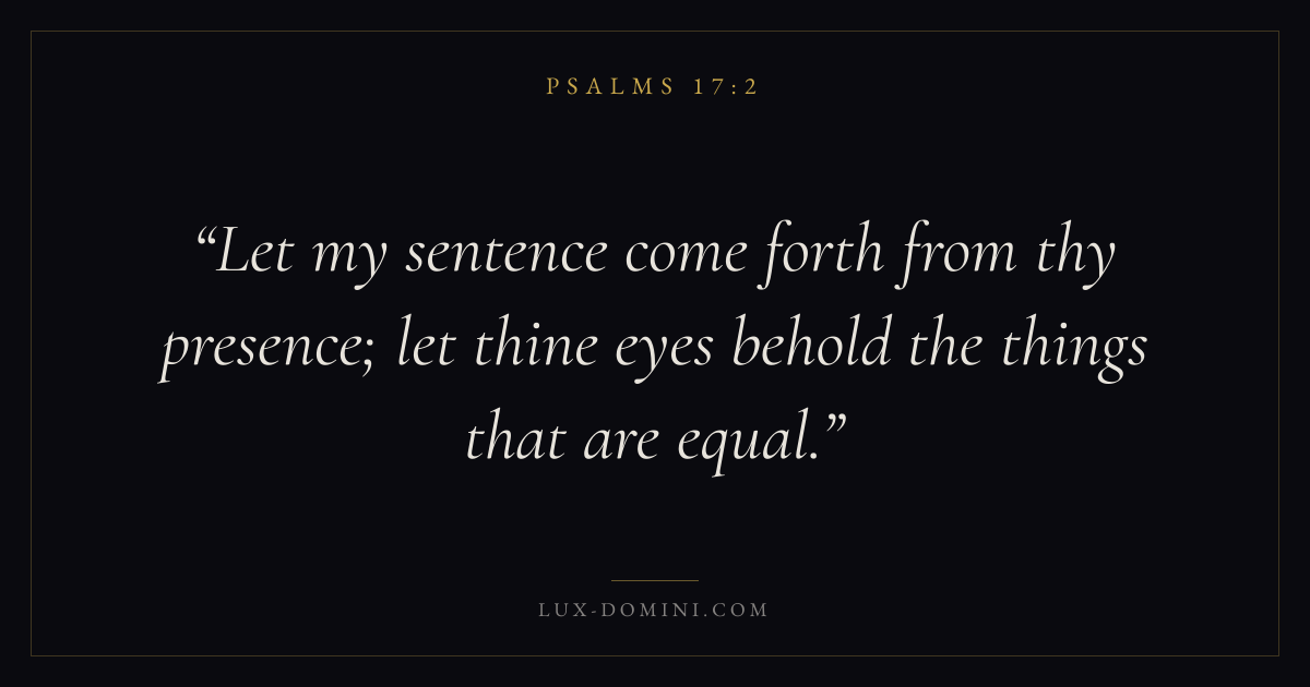 Books / Psalms / Chapter 17 / Verse 2 ← Psalms 17:1 Psalms 17:2 Psalms 17:3 → Let my sentence come forth from thy presence; let thine eyes behold the things that are equal. Download verse card Share on Twitter Share on Facebook Pin it ✦ Key themes FaithPrayerPraiseLament Read with Hebrews 11:1Romans 10:17Matthew 6:9Luke 18:1 Related topics Bible verses about faithBible verses about prayerBible verses about thankfulness and gratitudeBible verses about grief and loss ✦ Psalms Chapter 17 verses V. 1 V. 2 V. 3 V. 4 V. 5 V. 6 V. 7 V. 8 V. 9 V. 10 V. 11 V. 12 V. 13 V. 14 V. 15
